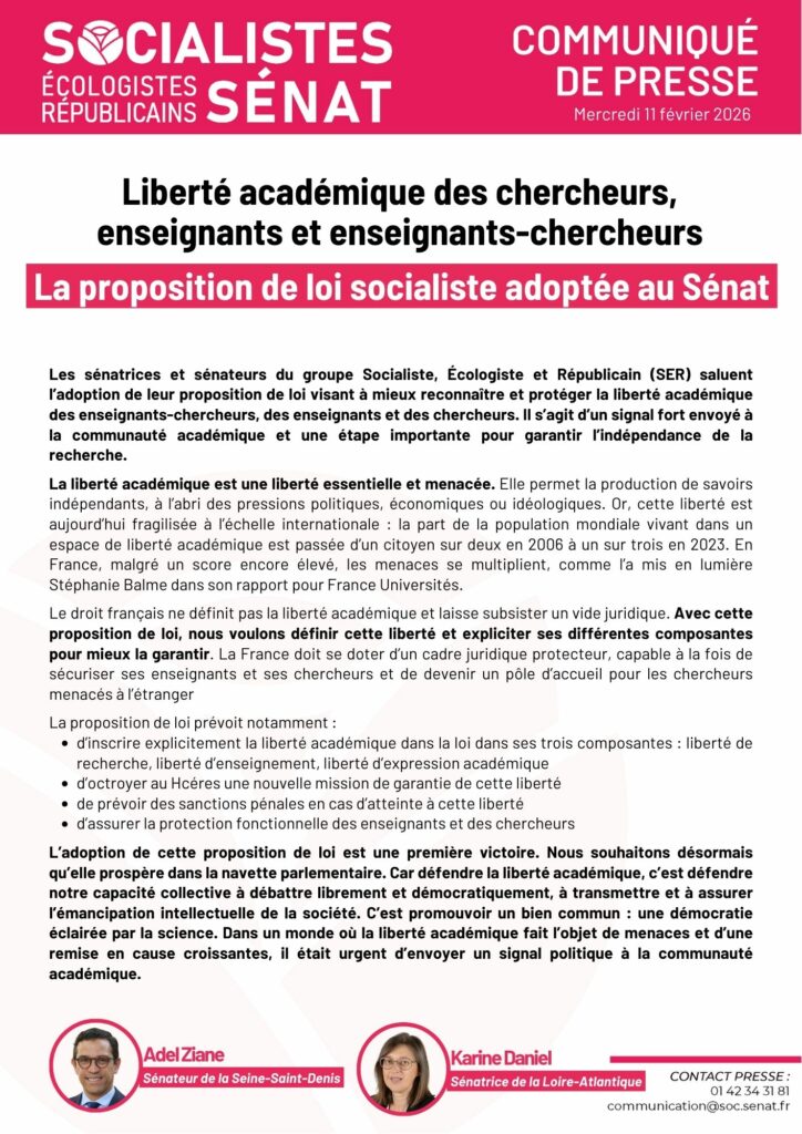 🎓 La proposition de loi portée par le sénateur Adel Ziane, et dont Karine Daniel était rapporteure, pour inscrire la liberté académique dans le Code de l’éducation et créer un rempart juridique contre les attaques réactionnaires.