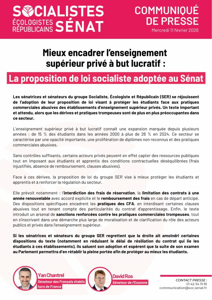 🎓 La proposition de loi portée par le sénateur Yan Chantrel, et dont David Ros était rapporteur, pour défendre les étudiant•es contre les dérives de l’enseignement supérieur privé à but lucratif.