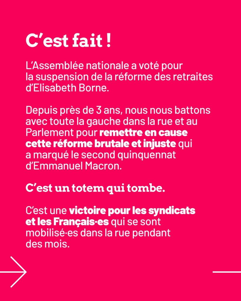 Un premier coup d’arrêt contre cette réforme injuste. La prochaine étape déterminante sera donc celle de l’élection présidentielle de 2027 au cours de laquelle nous défendrons l’abrogation de cette réforme Borne et un autre projet de société.