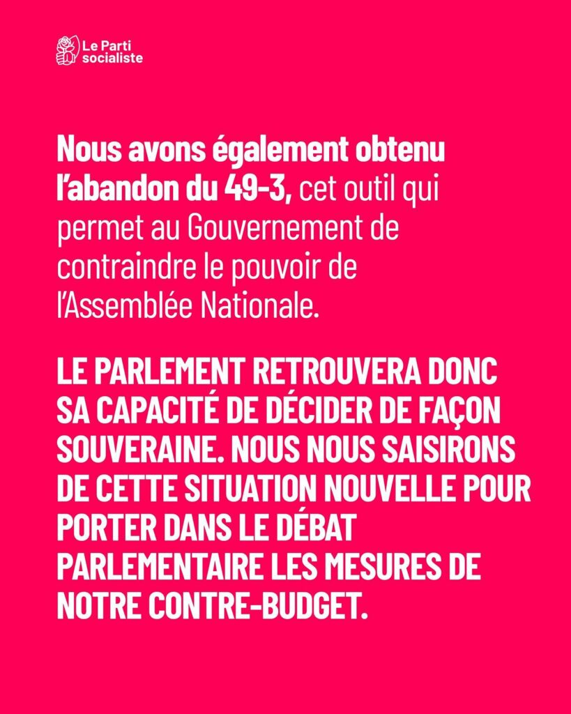 Nous obtenons aussi l’abandon du 49-3 par le Gouvernement. Cela permettra au Parlement de retrouver son pouvoir de décision. Nous saisirons cette situation nouvelle pour porter nos mesures dans le débat budgétaire : Taxe Zucman, hausse des salaires jusqu’à 2000 E, investissement pour les services publics et l’écologie.