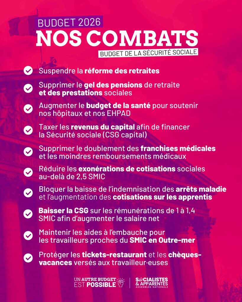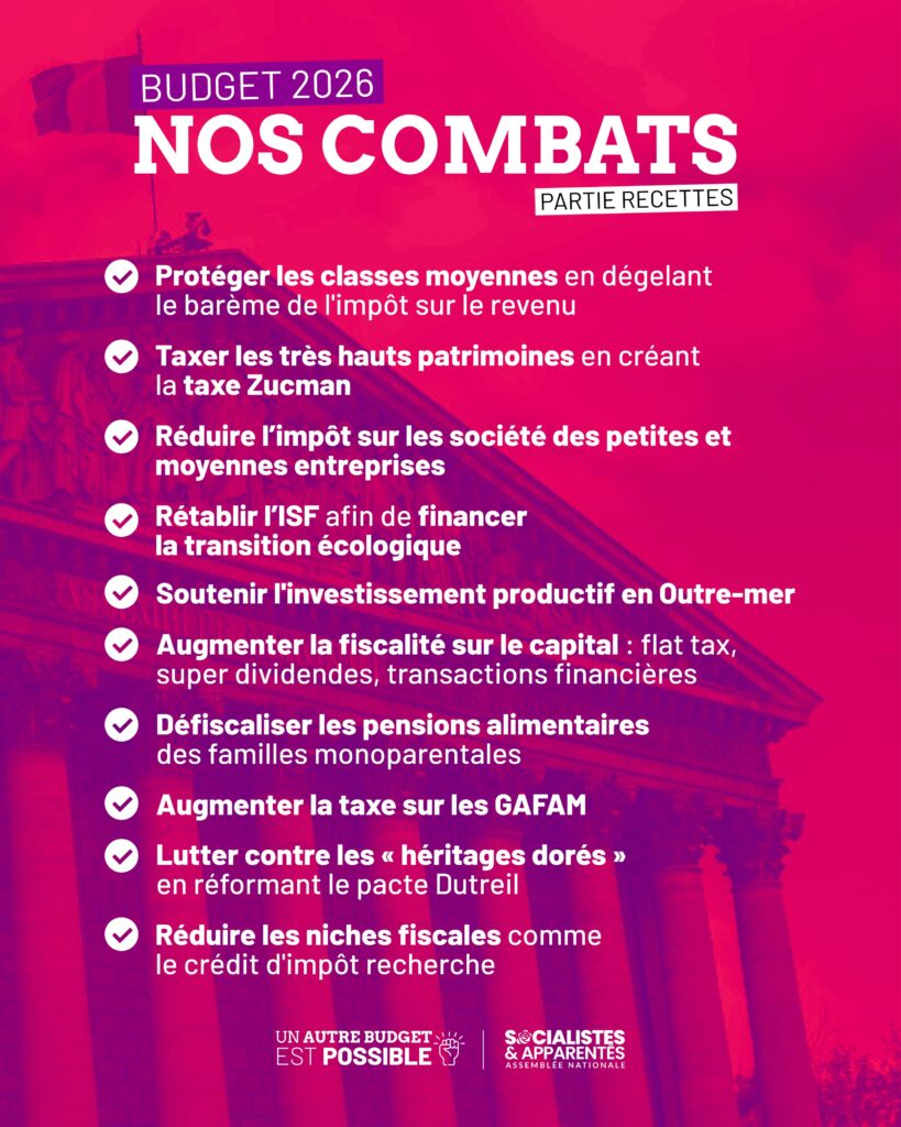 Après 8 ans de politiques libérales, les socialistes se battent, avec la gauche et les écologistes, pour porter un budget de justice sociale, fiscale et écologique, en défendant la taxe Zucman, les services publics et en protégeant les classes moyennes et précaires des mesures de casse sociale.