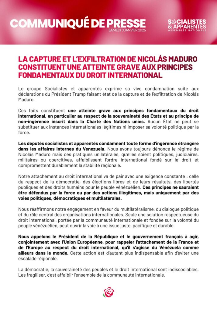 Nous condamnons la capture et l’exfiltration de Nicolás Maduro.