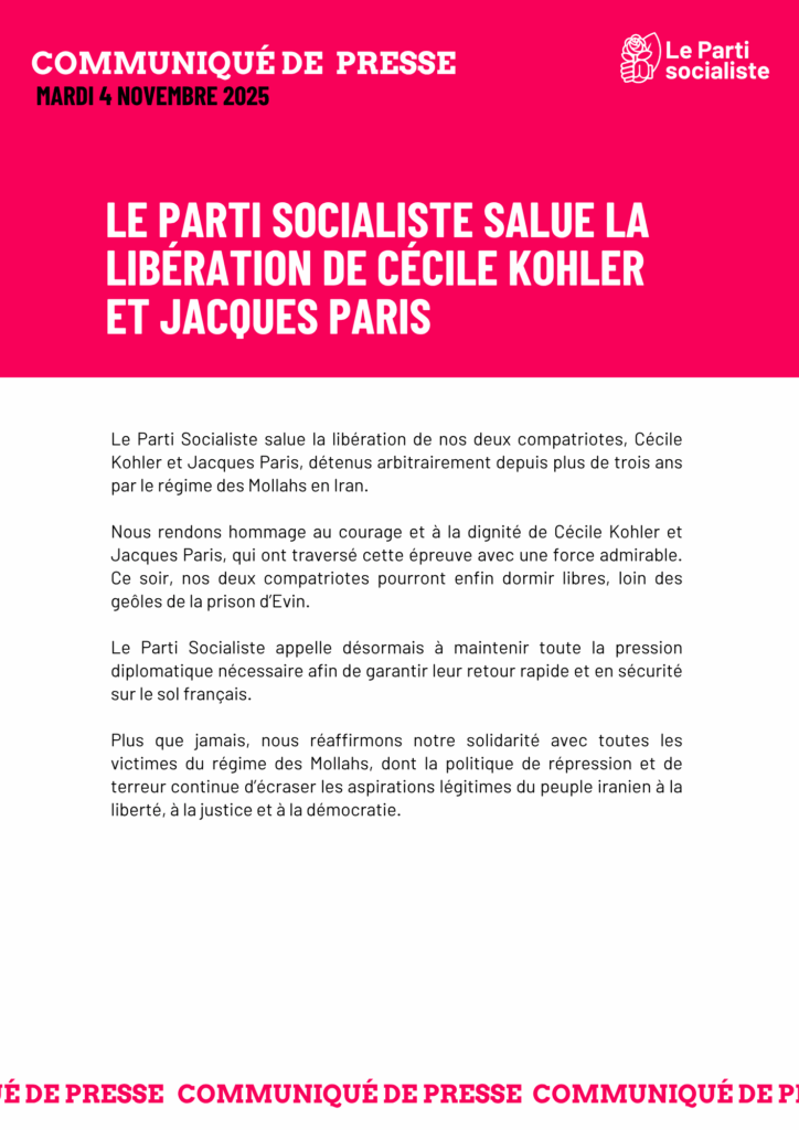 Communiqués de presse National Fédération de Haute-Saône du Parti socialiste 4.11.2025 – Le Parti socialiste salue la libération de Cécile Kohler et Jacques Paris PrevActualité précédente4.11.2025 – Cécile Kohler et Jacques Paris libérés ! Communiqués de presse Fédération 22.10.2025 – Non-censure : courage et responsabilité au service des Français Communiqués de presse Fédération 20.6.2025 – La Fédération de Haute-Saône au lendemain du 81ème Congrès du Parti socialiste Communiqués de presse Fédération 25.2.2025 – Soutien à Eric Houlley, maire de Lure Communiqués de presse Fédération 11.2.2025 – Election de Laurent Seguin à la tête du département de la Haute-Saône Communiqués de presse Fédération 21.11.2024 – Conférence de presse dans les locaux de la Fédé Communiqués de presse Fédération 28.9.2024 – Journées « Portes ouvertes » à la Fédé de Haute-Saône Communiqués de presse Fédération 3.9.2024 – Communiqué de notre 1er fédéral (Résolution du Bureau National après la dissolution) Communiqués de presse Fédération 1.7.2024 – Résultats du 1er tour des législatives en Haute-Saône Communiqués de presse Fédération 9.6.2024 – Elections européennes Communiqués de presse Fédération 3.2.2024 – Palestine-Israël : pour un cessez-le feu immédiat et une paix juste et durable Communiqués de presse Fédération 19.1.2024 – Le Rassemblement National refuse de siéger dans les territoires Communiqués de presse Fédération 19.12.2023 – La loi immigration